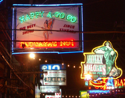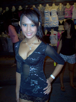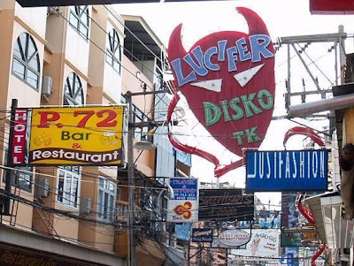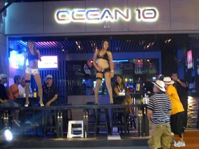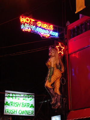 If you look at the signs, most of them are GoGo Bars. It took a couple of days for Lucy to work up the courage to enter and she was pretty shocked by what she saw. On the stage in the middle of the bar are about 30 naked girls, each of them has a small number taped to their side. The customer comes in, picks out whatever girl he wants, negotiates a price, pays the "Bar Fine" and takes the girl home. Just like buying groceries, nowadays you have to par extra for the bags.