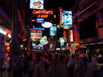 Our hotel was the P72 Bar and Restaurant on walking street. Walking street, so named because there are no cars allowed after 7:00 PM, is crammed with hotels, stores, chemists...you name it. Every square inch is being used for something and every shop has a neon sign above it, making navigation pretty difficult.