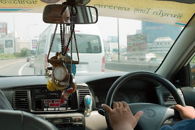 We managed to get a cheep flight from Khon Kean to Bangkok and took a taxi from the airport to Pattaya. This is the average taxi in Thailand. I have no idea how they see out the windows with all the clutter. I guess the Buddha protects them.